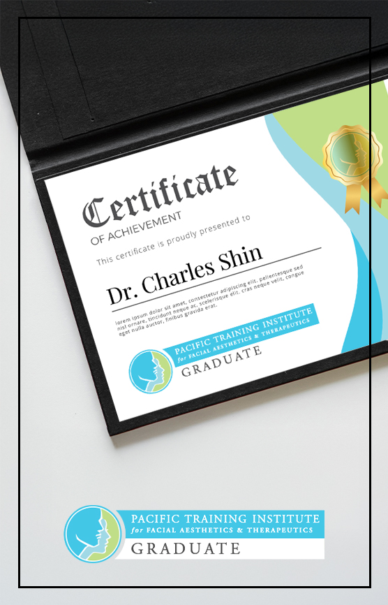 Dr. Shin is a graduate of the Pacific Training Institute for Facial Aesthetics & Therapeutics, an advanced anatomy-based training organization known for its high-caliber teaching and patient care practices. As a graduate, Dr. Shin joins some of the most highly trained and qualified botulinum toxin and facial rejuvenation practitioners in the world.